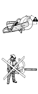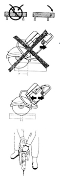 鋸軌機可能會發(fā)生突然猛力回彈。如果不按以下的要求進行操作,我們可能會遇到很嚴重的傷害甚至死亡。如果鋸片的一部分(如下圖所示)被用于進行切割,鋸片很可能在切口處向上跳起,進而將鋸軌機機身向后甩出,并重重地打在操作者身上。