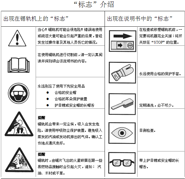 出現(xiàn)在鋸軌機及說明書上的"標志"解釋