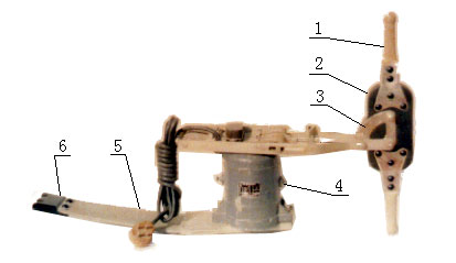 基本結(jié)構(gòu):1手把、2彈性把座、3調(diào)整板、4電機殼、5鎬板、6搗固爪